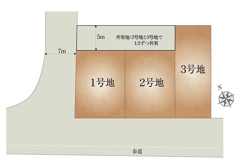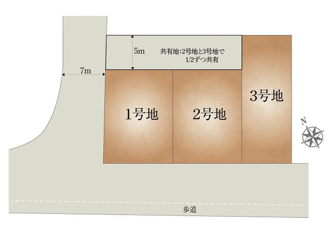 | 備考 | 2号地・3号地:敷地面積の他に共有地49.87m2の1/2ずつ負担持分があります。 | ||