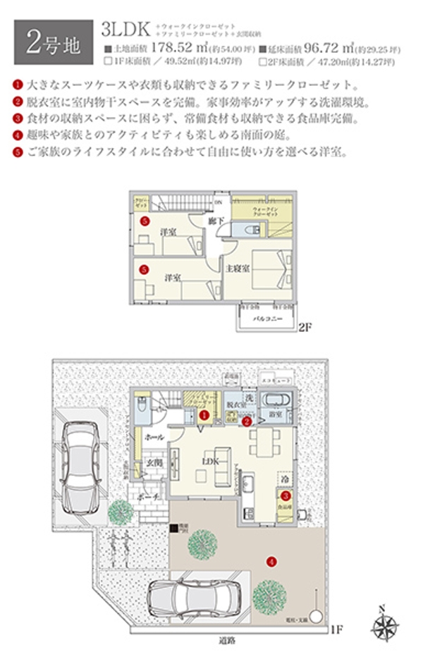 | 建物面積 | 96.72m2(2号地) | 土地面積 | 178.52m2(2号地) 私道負担なし |