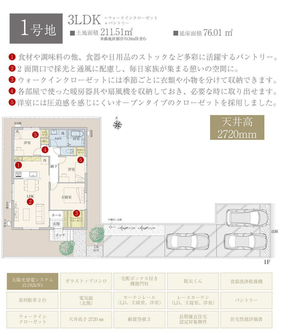 | 建物面積 | 76.01m2(1号地)、76.01m2(2号地) | 土地面積 | 211.51m2(1号地)、170.73m2(2号地) 全て私道負担なし |