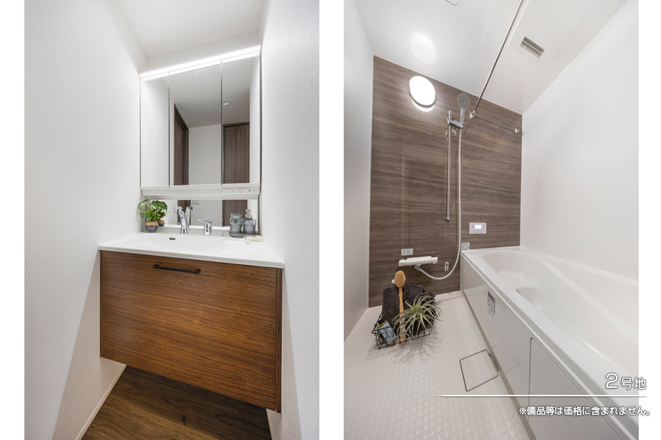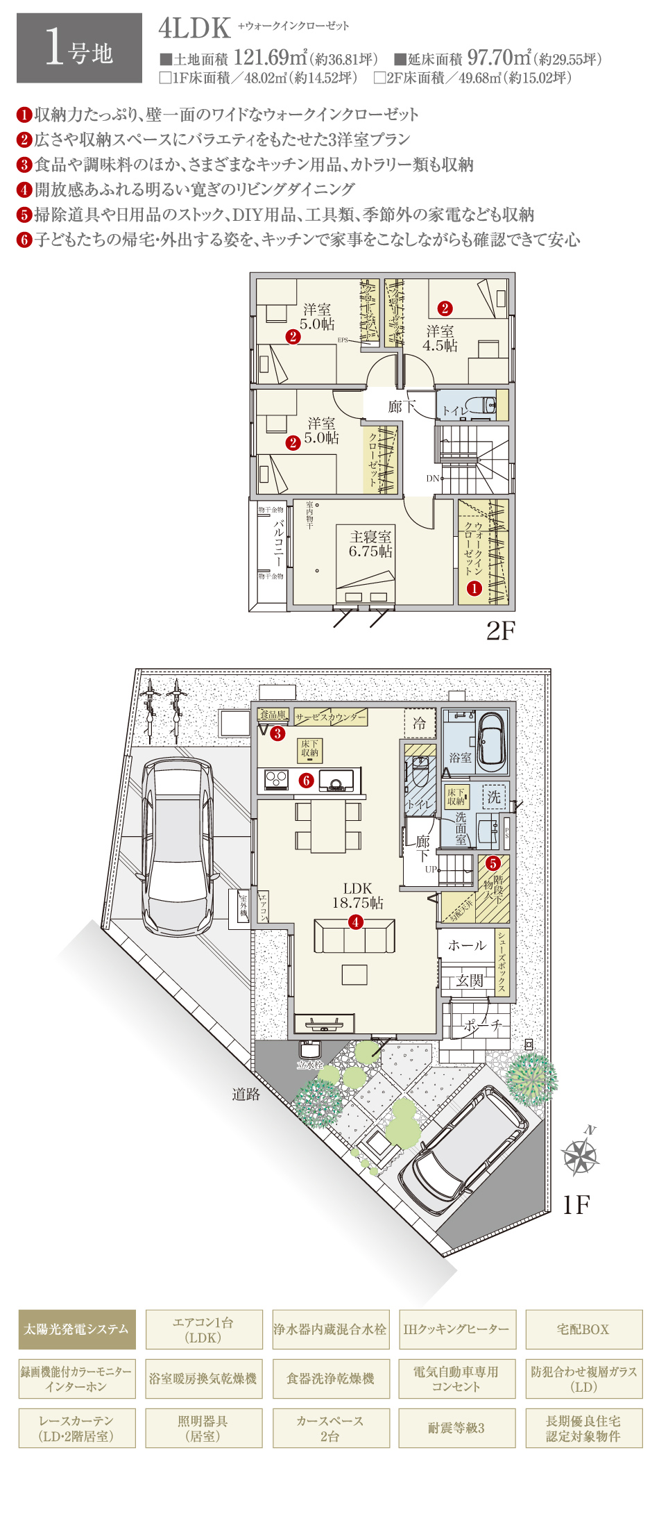 | 建物面積 | 97.70m2(1号地)、96.05m2(2号地) | 土地面積 | 121.69m2(1号地)、131.39m2(2号地) 全て私道負担なし |