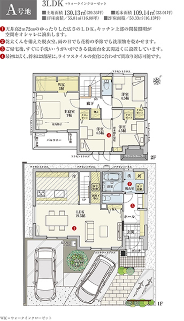 | 建物面積 | 109.14m2(A号地) | 土地面積 | 130.13m2(A号地) 私道負担なし |