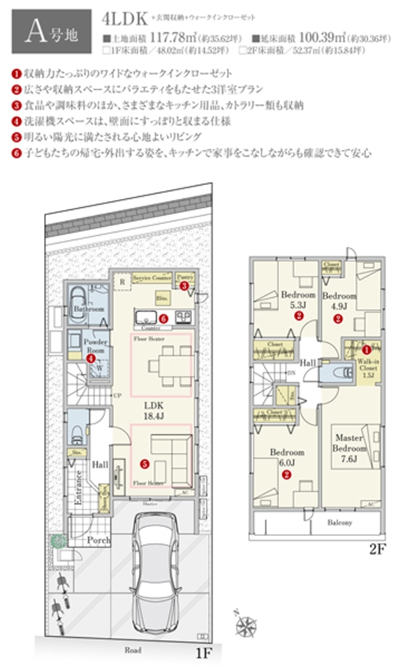 | 建物面積 | 100.39m2(A号地) | 土地面積 | 117.78m2 私道負担あり 178.98m2のうち、8分の1の負担持分(A号地) |