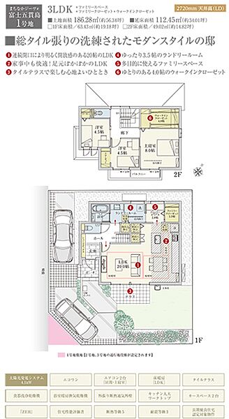 | 建物面積 | 112.45m2(1号地) | 土地面積 | 186.28m2(1号地) 私道負担なし |