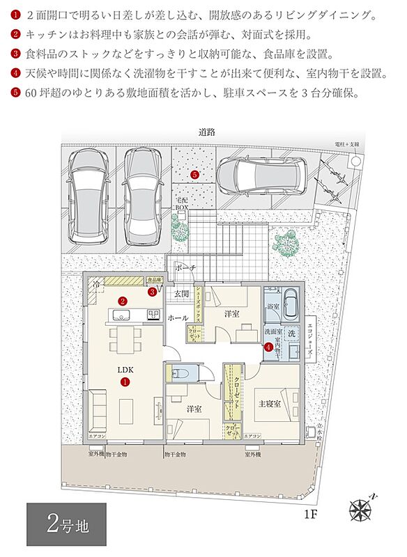 | 駐車場 | 2台 | 道路の幅員 | 6m(アスファルト舗装) |