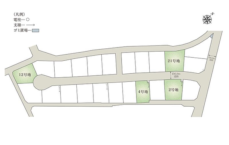| 間取り | 3LDK(2号地、21号地)、4LDK(4号地、12号地) | 建物構造 | 軽量鉄骨1階建(2戸)、軽量鉄骨2階建(2戸) |