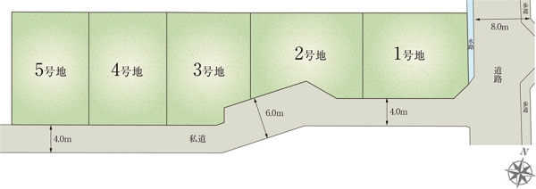 - 183.18m2 私道負担あり 348m2のうち、14分の5の負担持分(1号地)、184.80m2 私道負担あり 348m2のうち、14分の5の負担持分(2号地)、183.12m2 私道負担あり 348m2のうち、14分の5の負担持分(3号地)、181.60m2 私道負担あり 348m2のうち、14分の5の負担持分(4号地)、181.77m2 私道負担あり 348m2のうち、14分の5の負担持分(5号地)