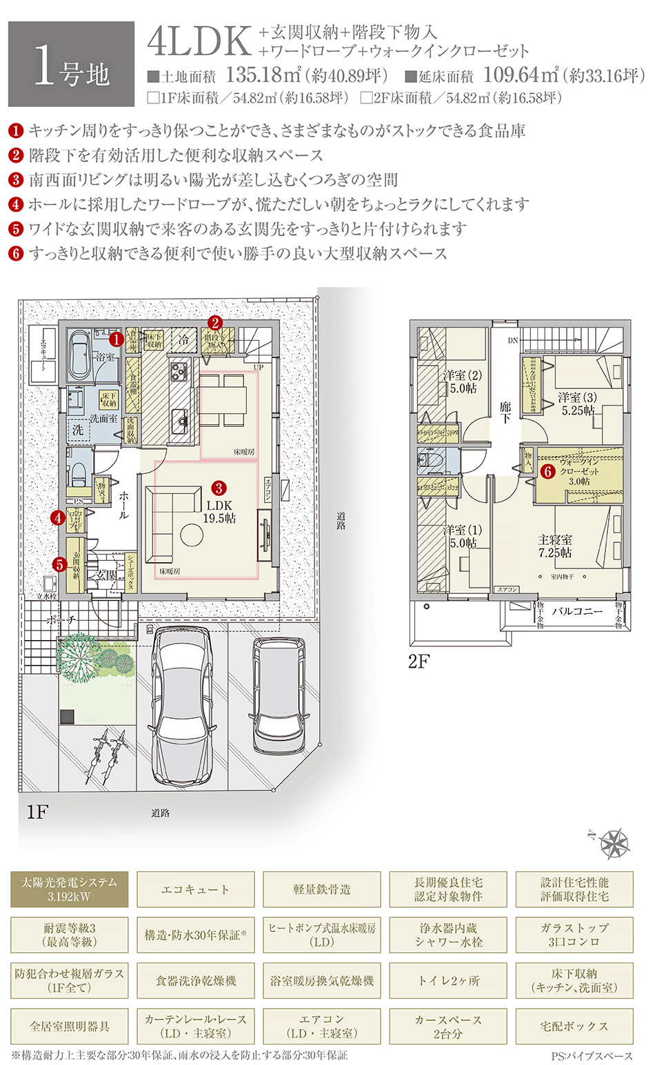 | 建物面積 | 109.64m2(1号地) | 土地面積 | 135.18m2(1号地) 私道負担なし |