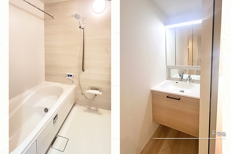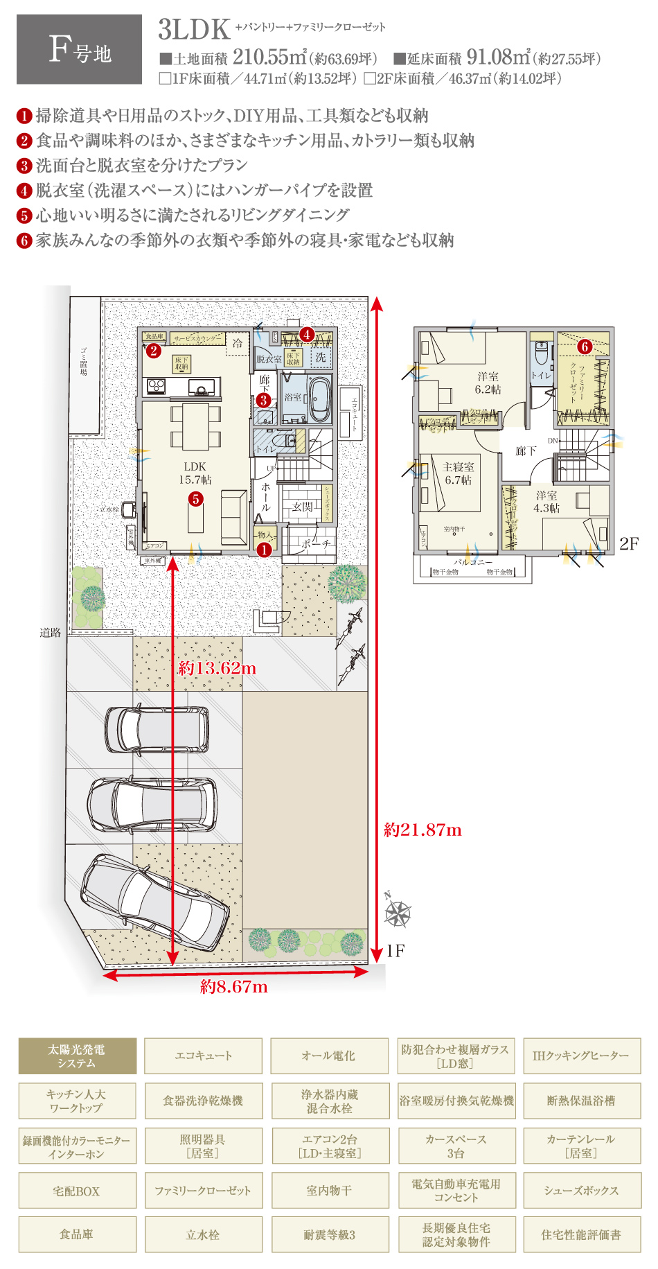 | 建物面積 | 105.98m2(E号地)、91.08m2(F号地) | 土地面積 | 214.69m2(E号地)、210.55m2(F号地) 全て私道負担なし |