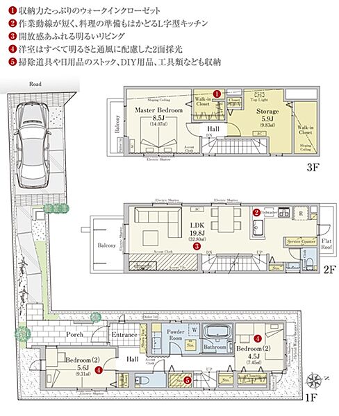 | 建物面積 | 120.89m2(3号地) | 土地面積 | 105.68m2(3号地) 私道負担なし |