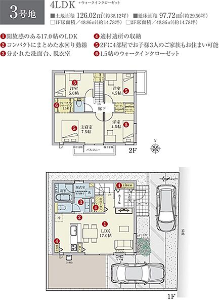 | 建物面積 | 97.72m2(3号地) | 土地面積 | 126.02m2(3号地) 私道負担なし |