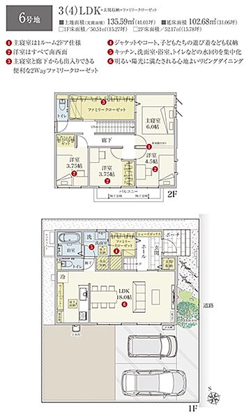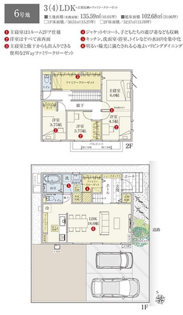 | 建物面積 | 102.68m2(5号地)、102.68m2(6号地) | 土地面積 | 135.59m2(5号地)、135.59m2(6号地) 全て私道負担なし |
