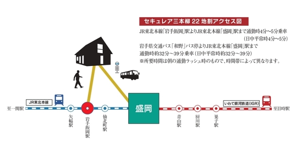 JR東北本線「岩手飯岡」駅 徒歩30分~31分 JR東北本線「盛岡」駅 徒歩90分~90分 |
