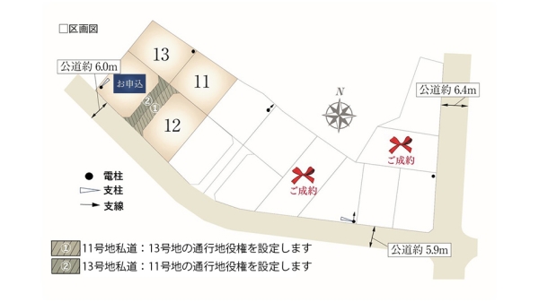 | 備考 | 防火指定/法22条区域 ※11号地所有の私道、42.86m2には13号地の通行地役権を設定します。13号地所有の私道、42.48m2には11号地の通行地役権を設定します。 | ||