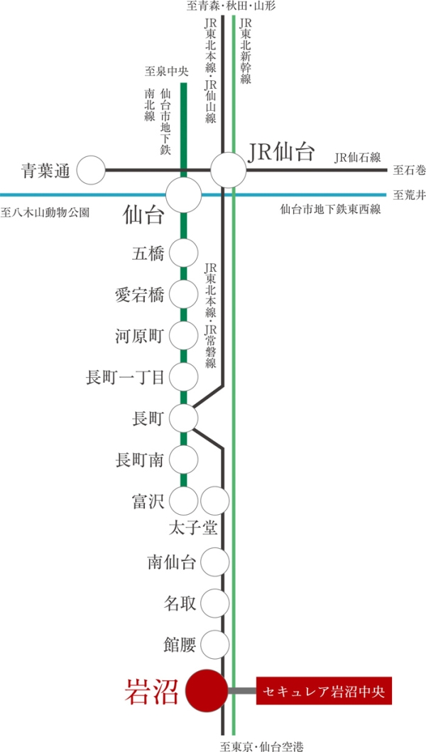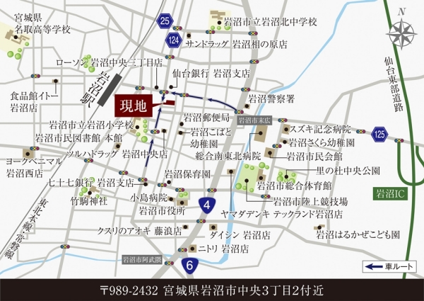 JR東北本線「岩沼」駅まで徒歩圏内、主要道路岩沼バイパスまで車で約2分