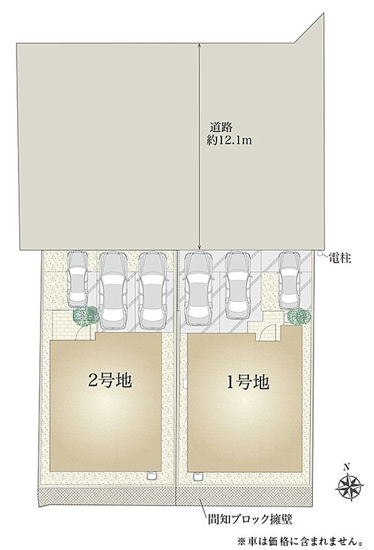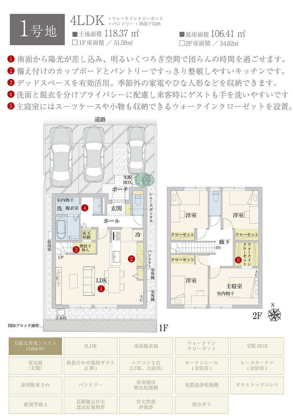 | 建物面積 | 106.41m2(1号地)、105.42m2(2号地) | 土地面積 | 118.37m2(1号地)、118.90m2(2号地) 全て私道負担なし |
