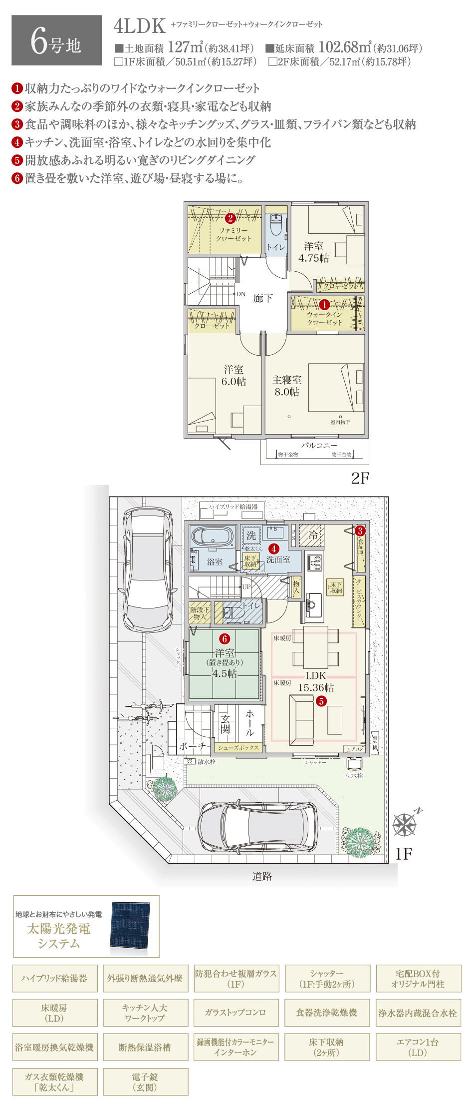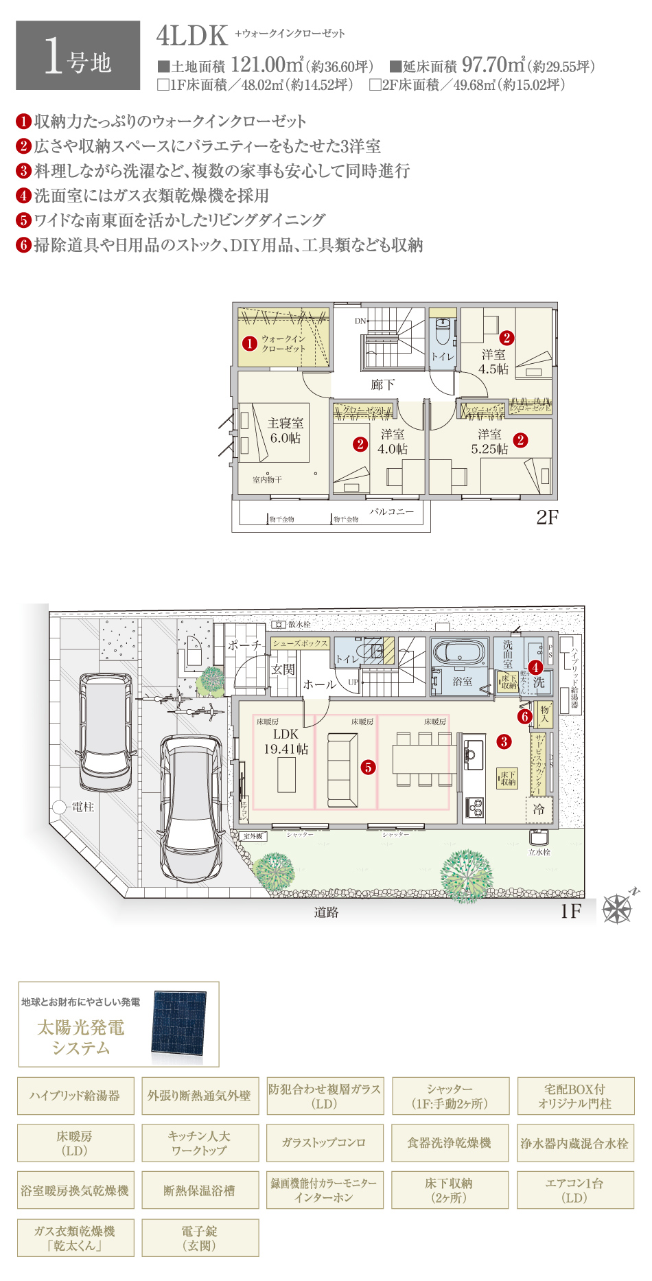 | 建物面積 | 97.70m2(1号地)、97.70m2(2号地)、102.68m2(3号地)、97.70m2(4号地)、102.68m2(5号地)、102.68m2(6号地) | 土地面積 | 121.00m2(1号地、2号地、3号地)~135.00m2(4号地) 全て私道負担なし |