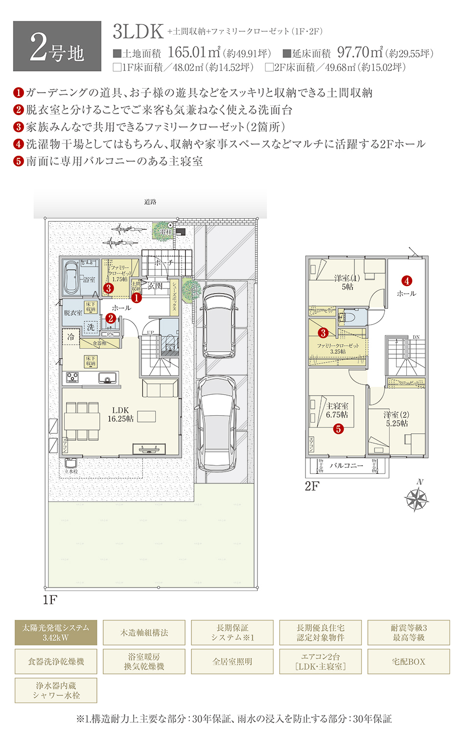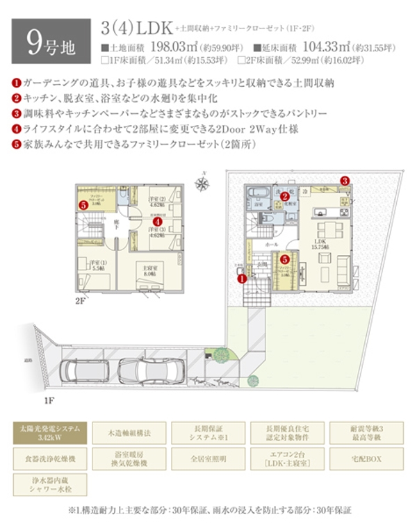 | 建物面積 | 97.70m2(2号地)、104.34m2(3号地)、102.68m2(4号地)、104.33m2(9号地) | 土地面積 | 165.01m2(2号地)、165.02m2(3号地)、165.00m2(4号地)、198.03m2(9号地) 私道負担なし |