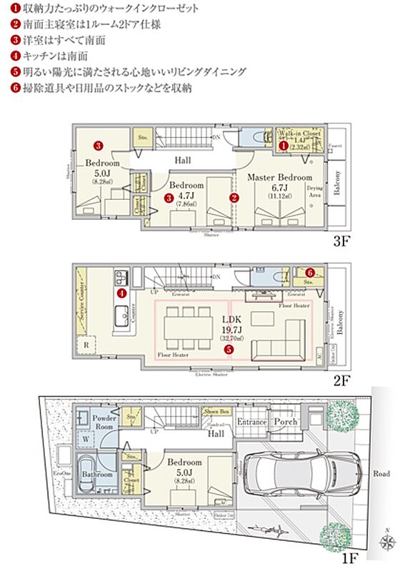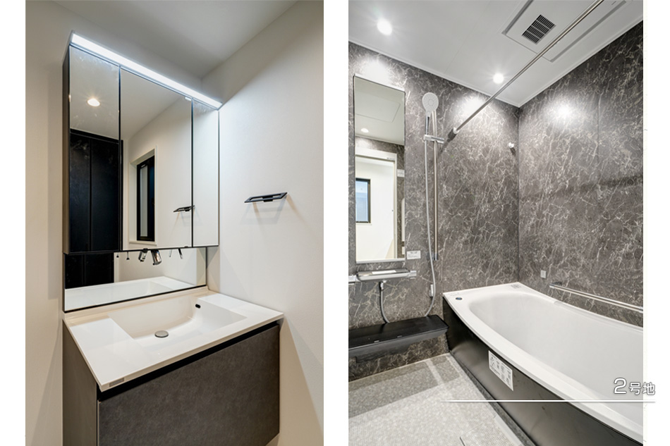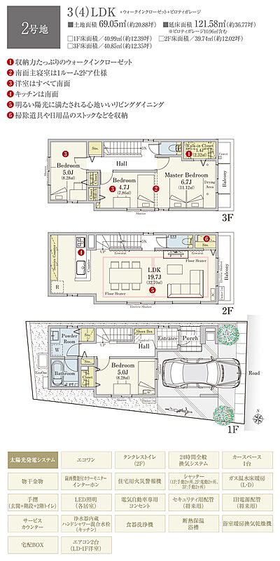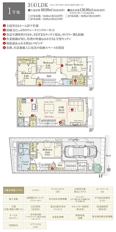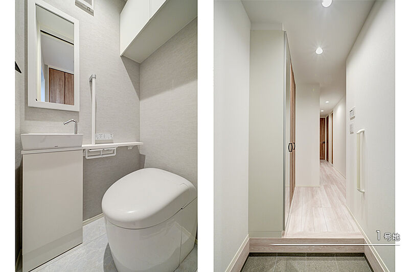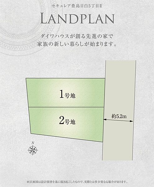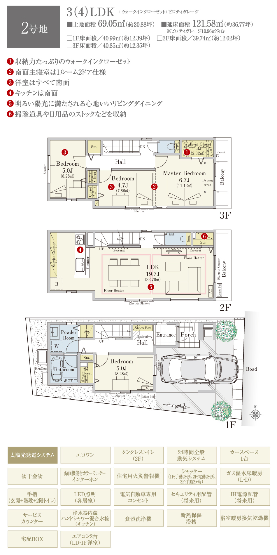 | 建物面積 | 126.96m2(1号地)、121.58m2(2号地) | 土地面積 | 68.09m2(1号地)、69.05m2(2号地) 全て私道負担なし |