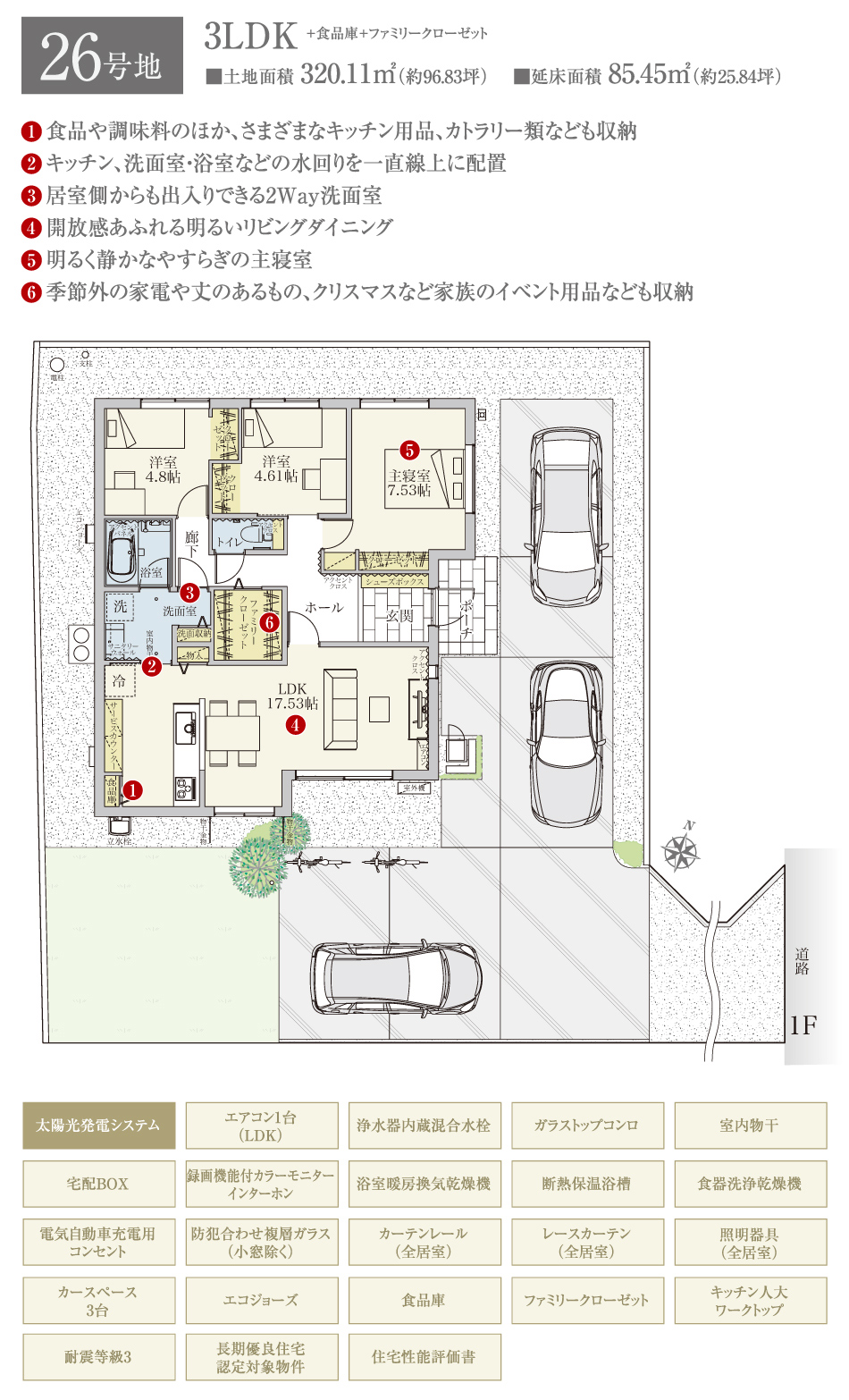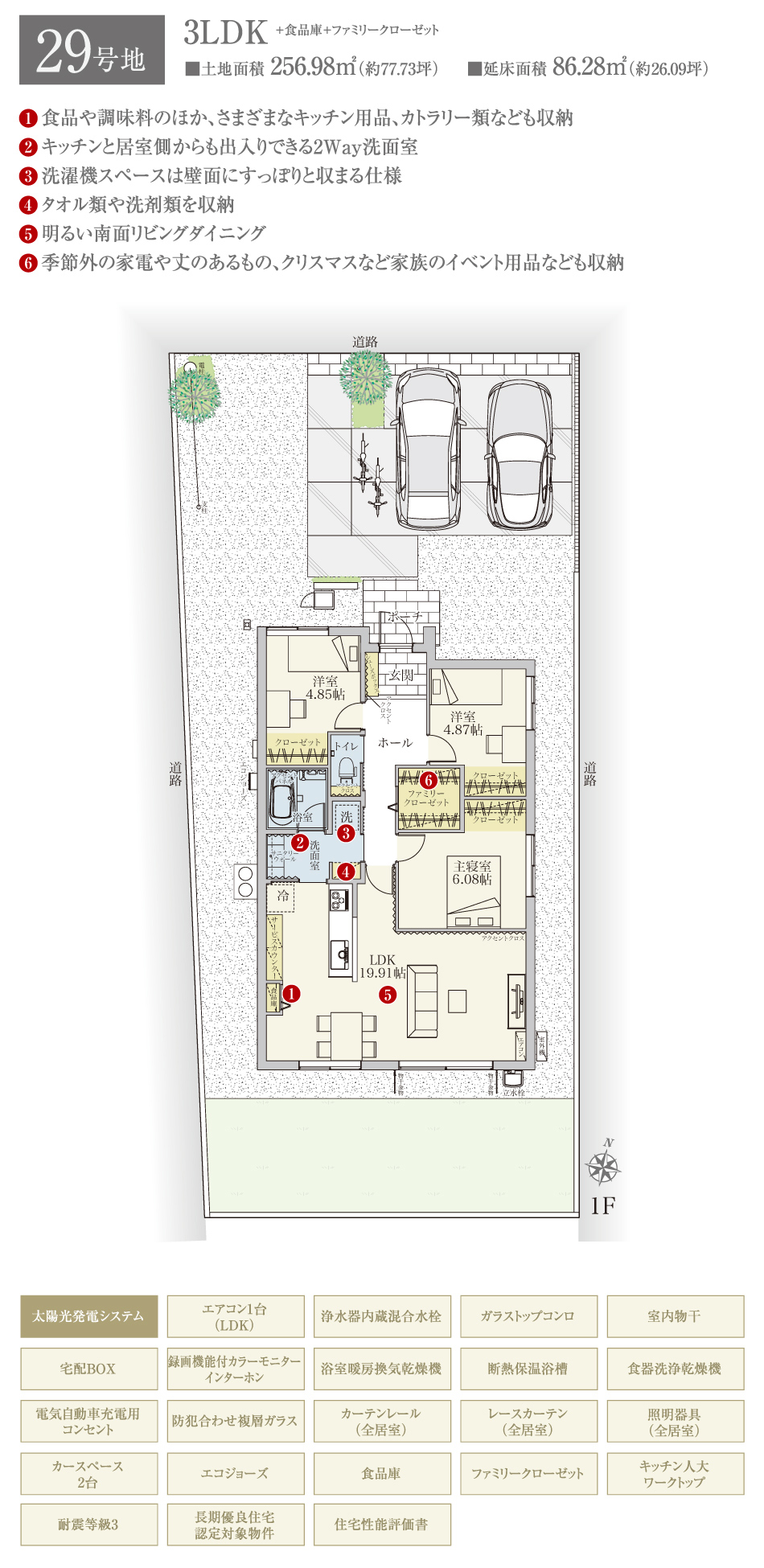 | 建物面積 | 85.45m2(26号地)、87.11m2(27号地)、87.02m2(28号地)、86.28m2(29号地) | 土地面積 | 320.11m2(26号地)、256.89m2(27号地)、256.95m2(28号地)、256.98m2(29号地) 私道負担なし |
