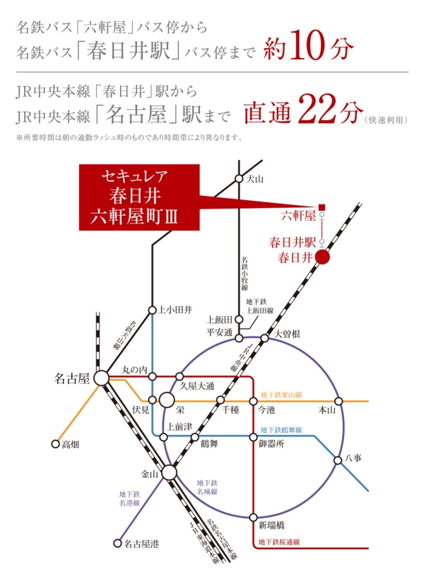 徒歩4分の「六軒屋」バス停よりJR中央本線「春日井」駅まで名鉄バス「春日井駅行」約10分。
