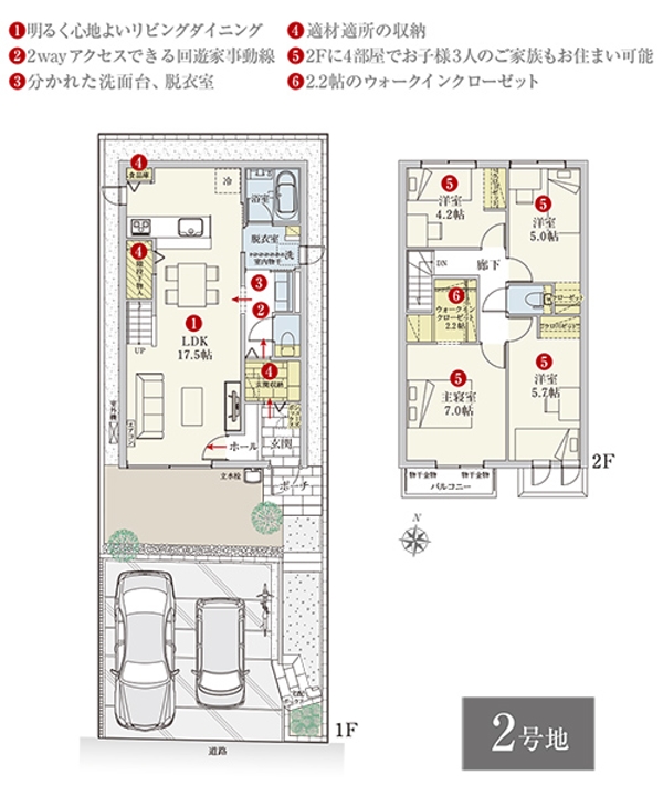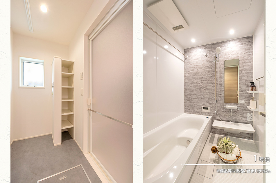 | 建物面積 | 104.66m2(1号地)、104.66m2(2号地) | 土地面積 | 129.85m2(1号地)、130.94m2(2号地) 全て私道負担なし |