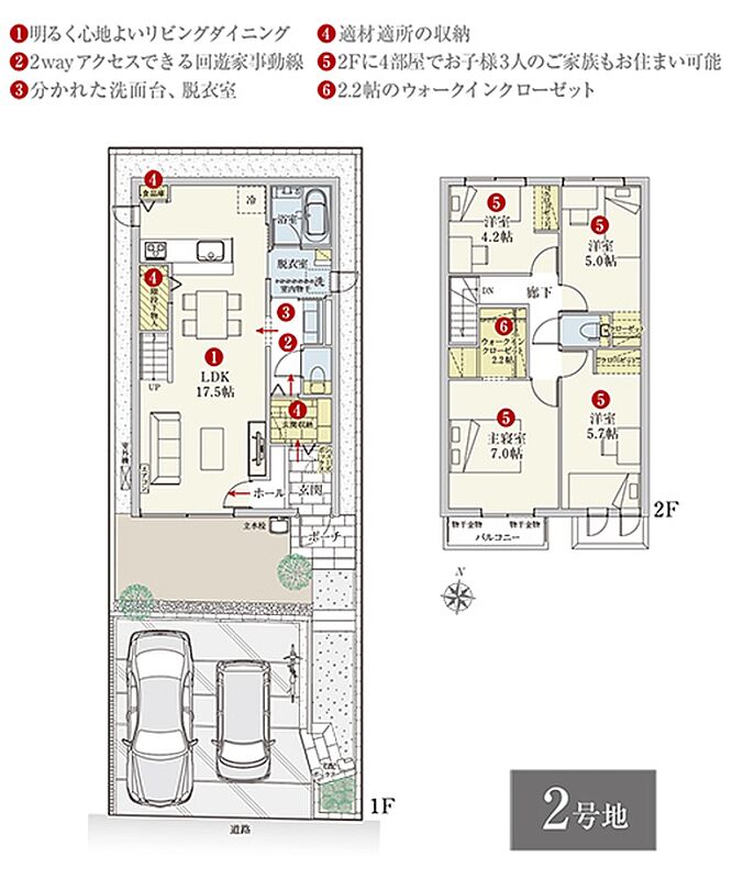 | 間取り | 4LDK(1号地、2号地) | 建物構造 | 軽量鉄骨2階建(2戸) |