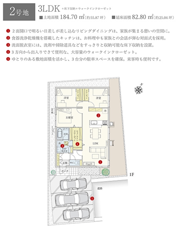 | 建物面積 | 82.80m2(2号地) | 土地面積 | 184.70m2(2号地) 私道負担なし |