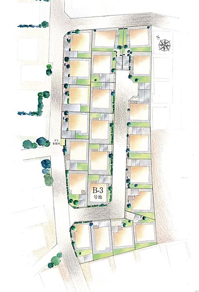 | 建物面積 | 97.72m2(B-3号地) | 土地面積 | 125.14m2 私道負担あり 461.39m2のうち17分の1(B-3号地) |