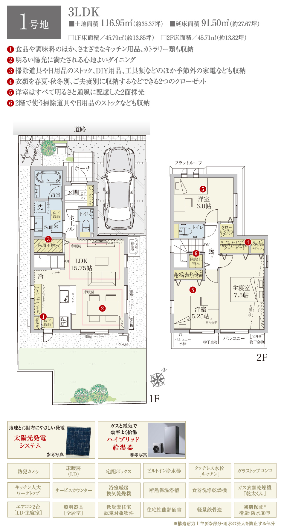 | 建物面積 | 91.50m2(1号地) | 土地面積 | 116.95m2 私道負担あり 5.84m2の負担持分(1号地) |
