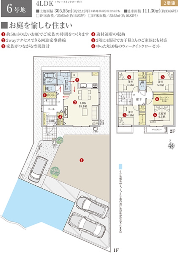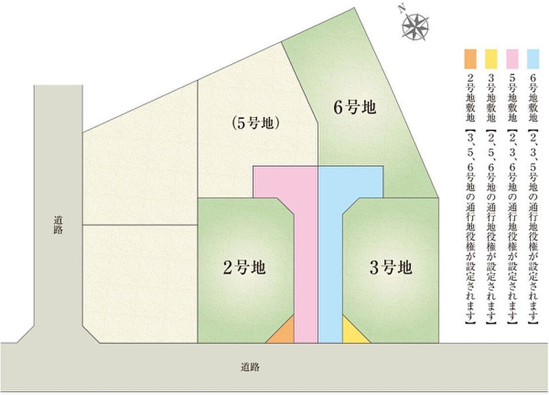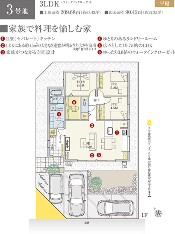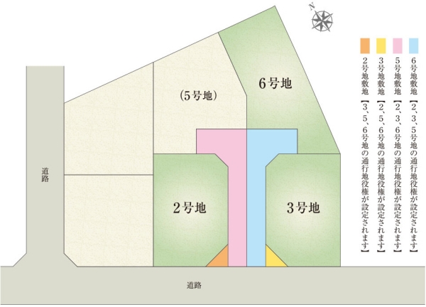 | 建物面積 | 90.42m2(2号地)、90.42m2(3号地)、111.30m2(6号地) | 土地面積 | 210.59m2(2号地)、209.68m2(3号地)、305.55m2(6号地) 私道負担なし |