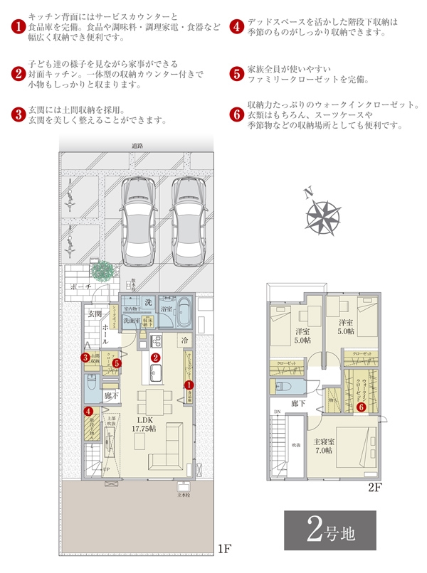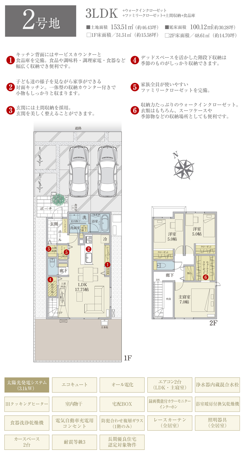 | 建物面積 | 104.66m2(1号地)、100.12m2(2号地)、103.34m2(4号地) | 土地面積 | 155.11m2(1号地)、153.51m2(2号地)、137.06m2(4号地) 私道負担なし |