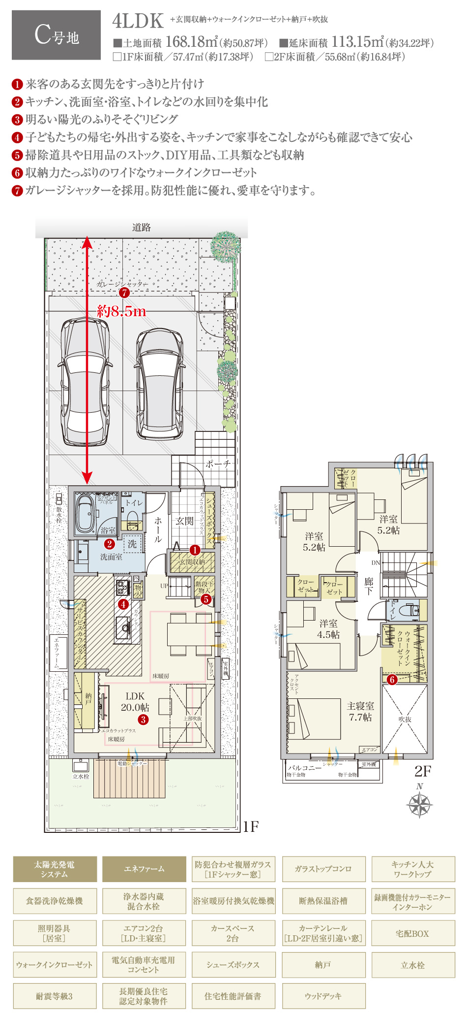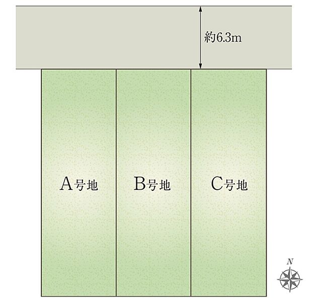 | 建物面積 | 118.41m2(A号地)、118.47m2(B号地)、113.15m2(C号地) | 土地面積 | 169.48m2(A号地)、168.19m2(B号地)、168.18m2(C号地) 私道負担なし |