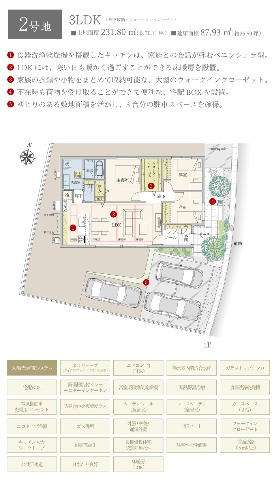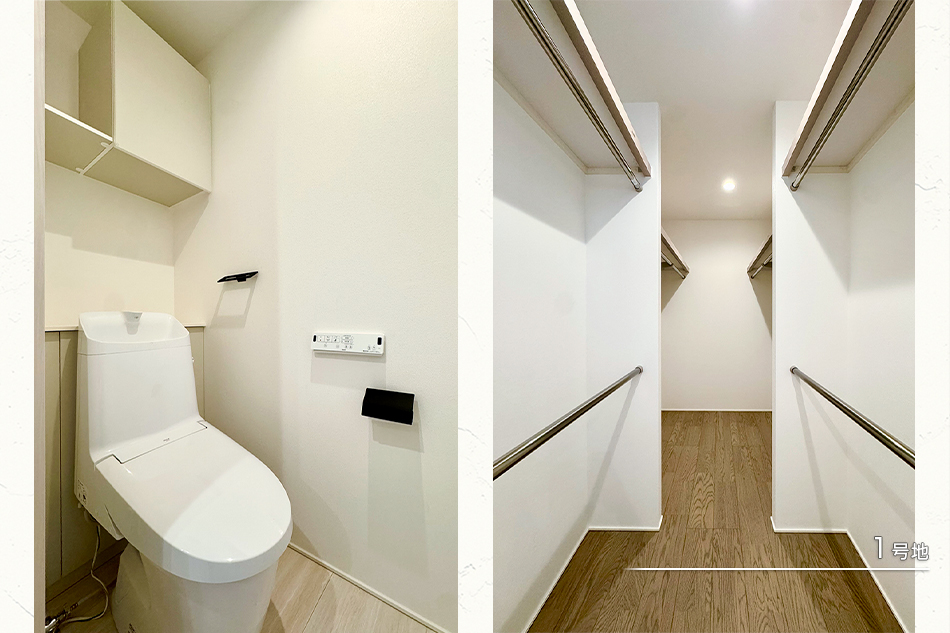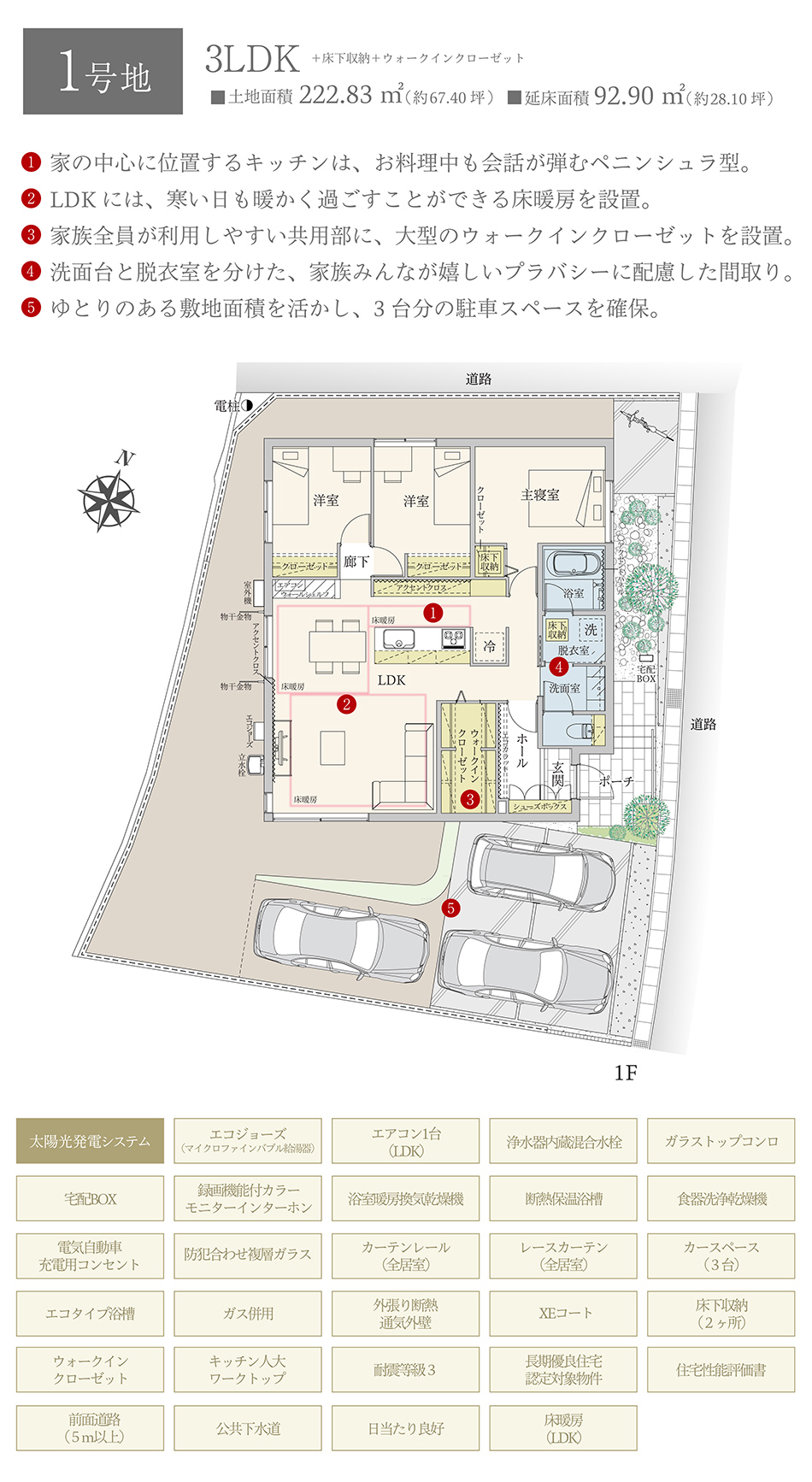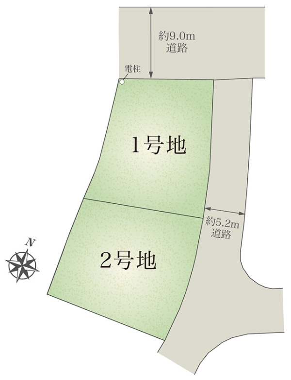 | 建物面積 | 92.90m2(1号地)、87.93m2(2号地) | 土地面積 | 222.83m2(1号地)、231.80m2(2号地) 全て私道負担なし |