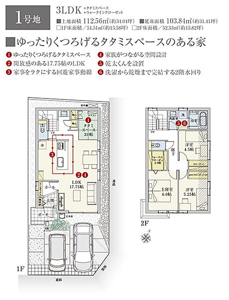 | 建物面積 | 103.84m2(1号地)、103.84m2(2号地) | 土地面積 | 112.56m2(1号地)、113.92m2(2号地) 全て私道負担なし |