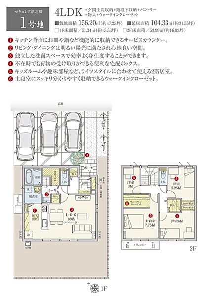 | 建物面積 | 104.33m2(1号地)、104.33m2(2号地) | 土地面積 | 156.20m2 私道負担あり 718.62m2のうち、11分の1の負担持分(1号地)、156.15m2 私道負担あり 718.62m2のうち、11分の1の負担持分(2号地) |
