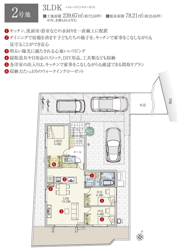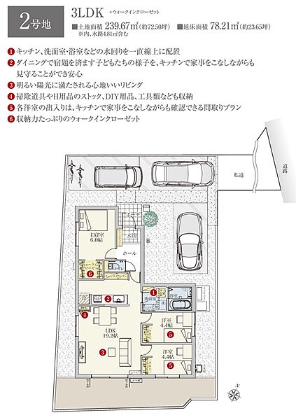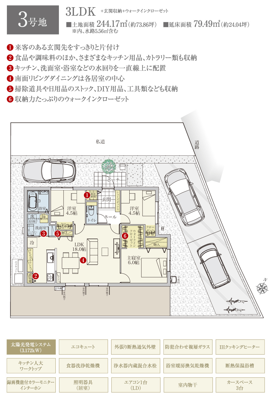 | 建物面積 | 78.66m2(1号地)、78.21m2(2号地)、79.49m2(3号地) | 土地面積 | 223.47m2 私道負担なし(1号地)、239.67m2 私道負担あり 67.83m2のうち、2分の1の負担持分(2号地)、244.17m2 私道負担あり 67.83m2のうち、2分の1の負担持分(3号地) |