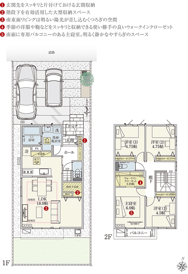| 駐車場 | 2台 | 道路の幅員 | 5.95m、6m(アスファルト舗装) |