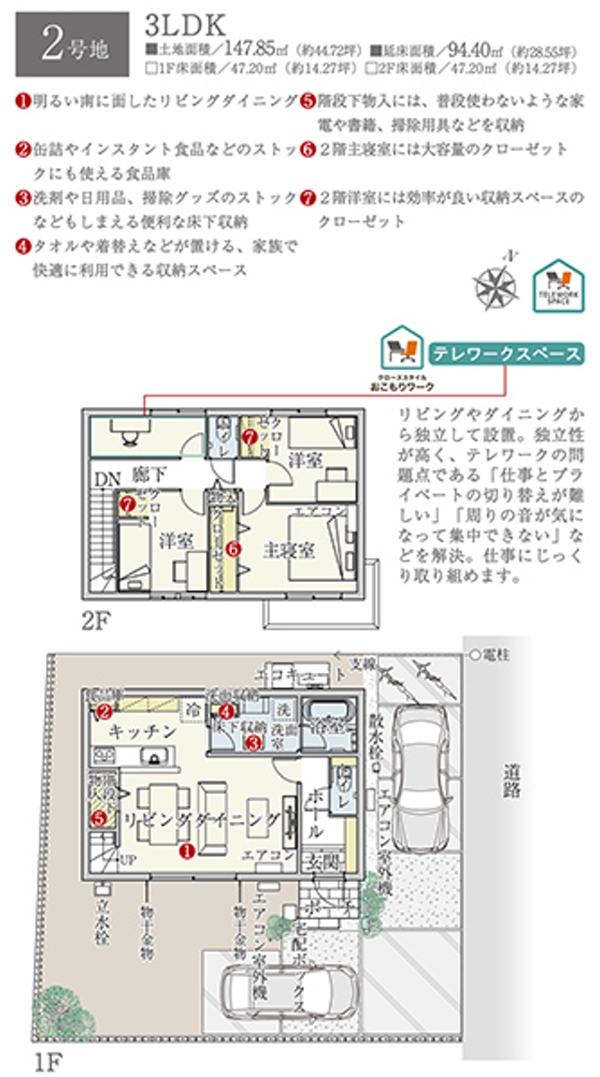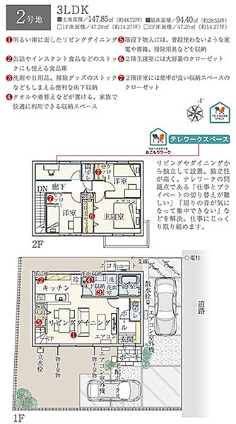 | 建物面積 | 101.36m2(1号地)、94.40m2(2号地) | 土地面積 | 147.79m2(1号地)、147.85m2(2号地) 全て私道負担なし |