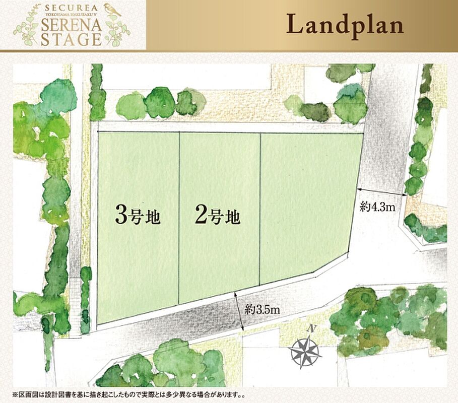 | 建物面積 | 101.36m2(2号地)、96.22m2(3号地) | 土地面積 | 102.55m2(2号地)、109.94m2(3号地) 全て私道負担なし |