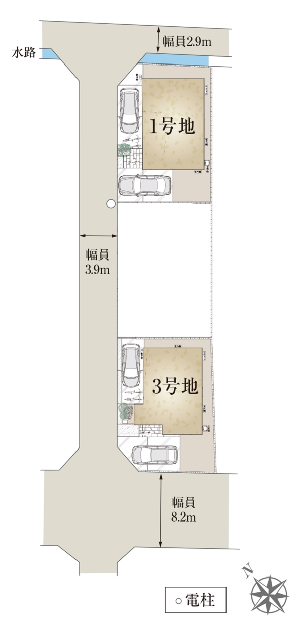 | 建物面積 | 94.40m2(1号地)、94.57m2(3号地) | 土地面積 | 115.42m2(1号地)、121.00m2(3号地) 全て私道負担なし |