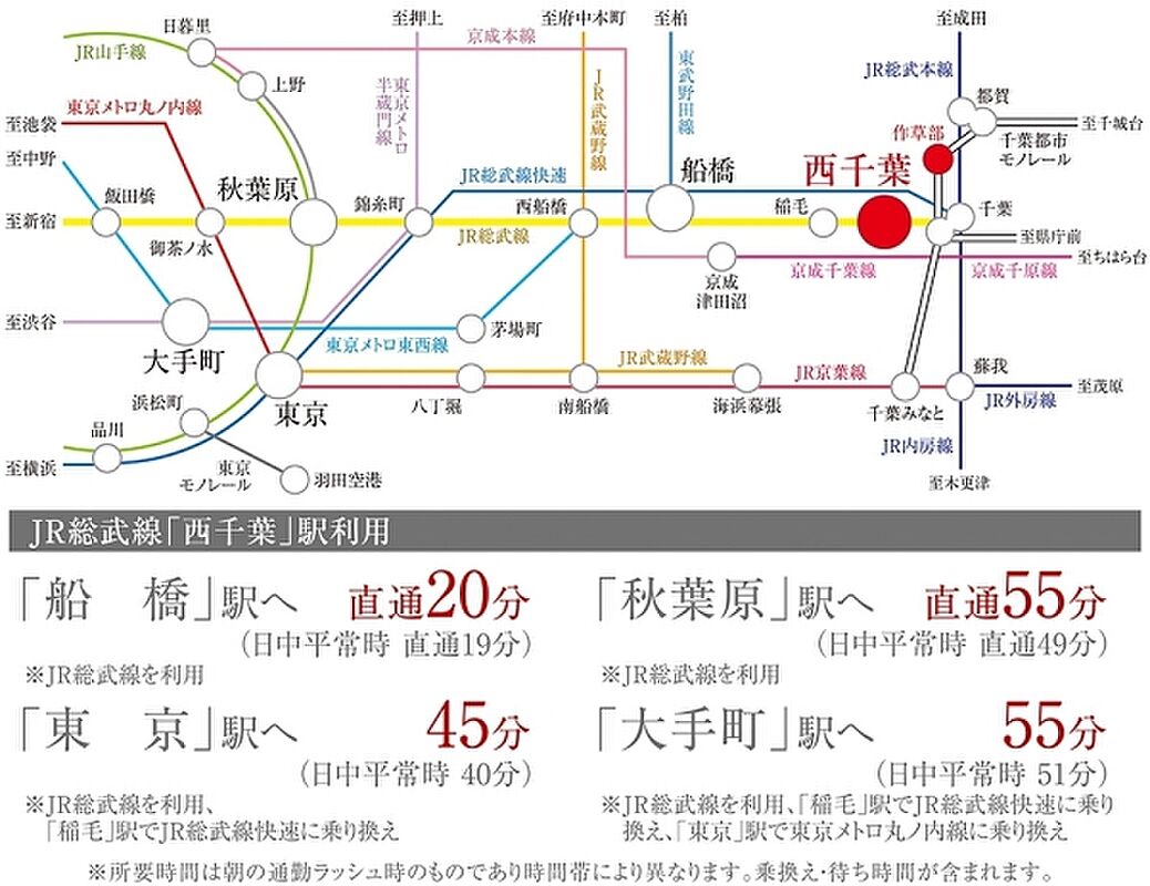 JR総武線「西千葉」駅徒歩10分、3駅の利用可能で交通アクセス快適です。