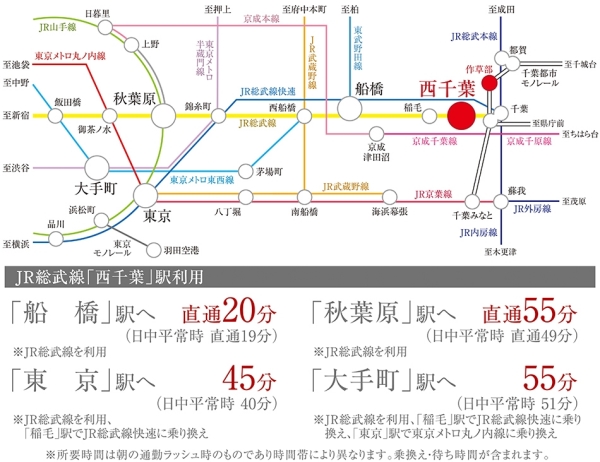 JR総武線「西千葉」駅徒歩10分、3駅の利用可能で交通アクセス快適です。