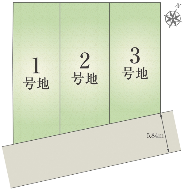 | 建物面積 | 105.66m2(1号地)、104.66m2(2号地)、104.66m2(3号地) | 土地面積 | 128.46m2(1号地)、125.17m2(2号地)、118.80m2(3号地) 私道負担なし |