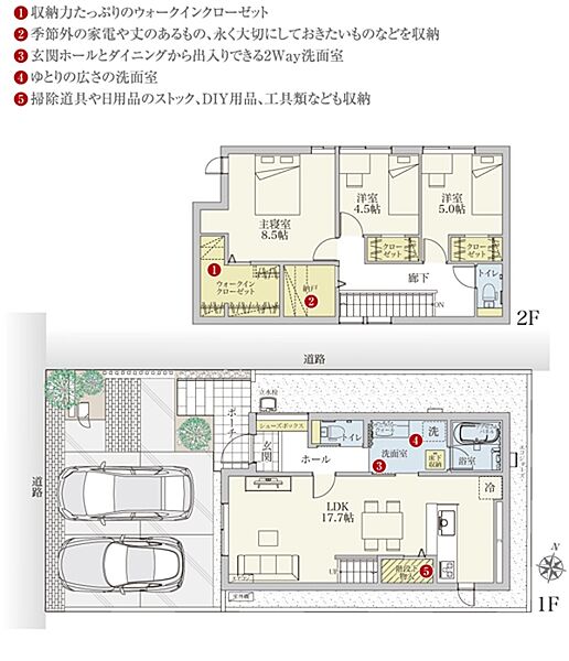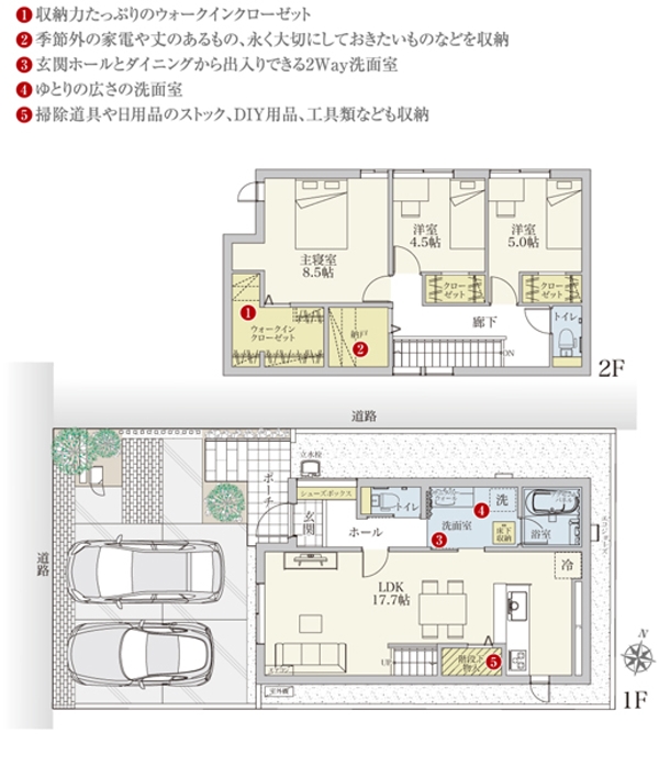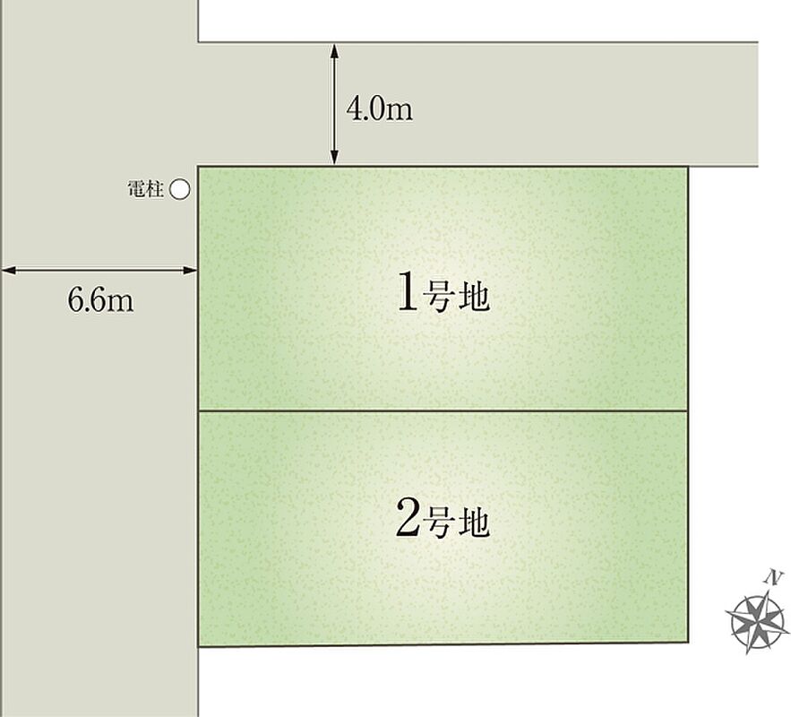 | 建物面積 | 106.49m2(1号地)、97.88m2(2号地) | 土地面積 | 125.11m2 私道負担あり 31m2の負担持分(1号地)、120.47m2 私道負担なし(2号地) |
