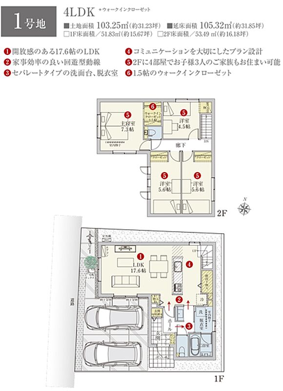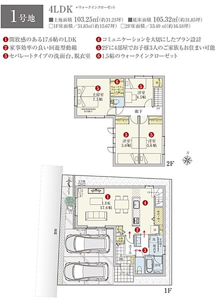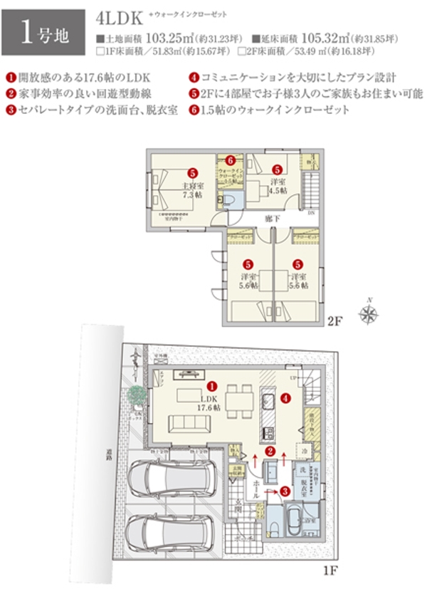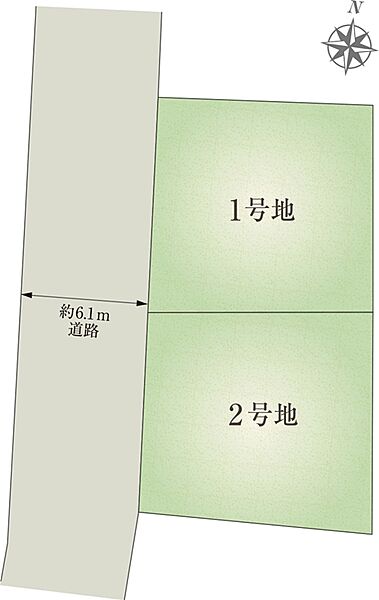 | 建物面積 | 105.32m2(1号地)、105.32m2(2号地) | 土地面積 | 103.25m2(1号地)、108.34m2(2号地) 全て私道負担なし |