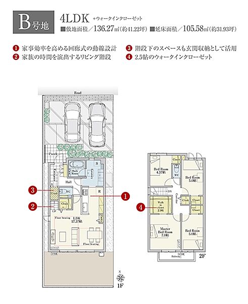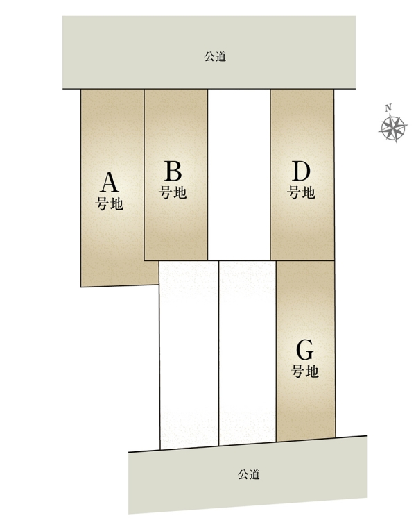 | 建物面積 | 105.58m2(A号地)、105.58m2(B号地)、98.89m2(D号地)、102.55m2(G号地) | 土地面積 | 160.92m2(A号地)、136.27m2(B号地)、137.50m2(D号地)、131.98m2(G号地) 私道負担なし |