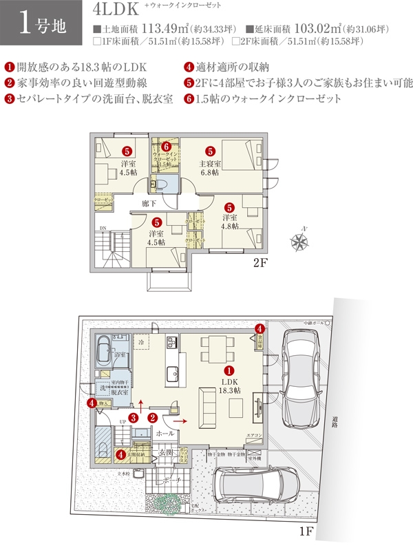 | 建物面積 | 103.02m2(1号地)、97.72m2(2号地) | 土地面積 | 113.49m2(1号地)、111.09m2(2号地) 全て私道負担なし |