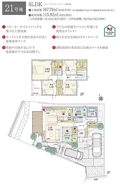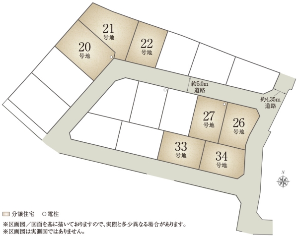 | 建物面積 | 107.65m2(26号地)~115.92m2(21号地) | 土地面積 | 121.09m2(22号地)~176.52m2(20号地) 全て私道負担なし |