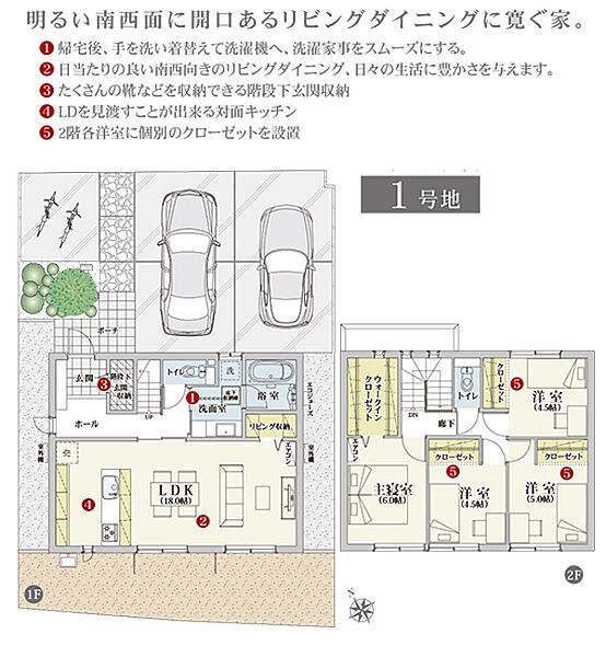 | 間取り | 4LDK(1号地、2号地) | 建物構造 | 軽量鉄骨2階建(2戸) |