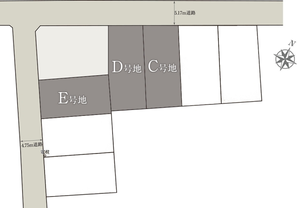 | 間取り | 3LDK(D号地、E号地)、4LDK(C号地) | 建物構造 | 軽量鉄骨2階建(3戸) |